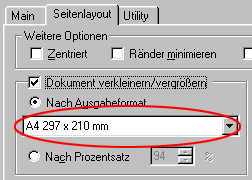 Markieren Sie im Menü Seiten-Layout (Windows) das Kontrollkästchen Dokument verkleinern/vergrößern und wählen Sie die Option Nach Ausgabeformat.