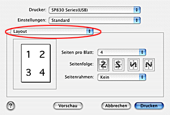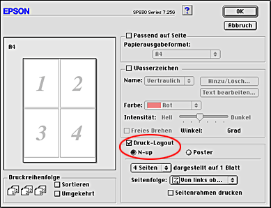 Auf dem Macintosh markieren Sie das Kontrollkästchen Druck-Layout im Dialogfenster Layout und wählen Sie dann N-up.