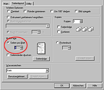 Druckt mehrere Seiten des Dokuments auf ein Einzelblatt. Sie können 1, 2, 4, 6, 9 oder 16 Seiten wählen.