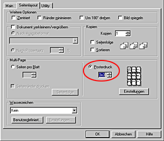 Klicken Sie auf die Schaltfläche Einstellungen, um die Parameter für den Posterdruck einzustellen. Das Dialogfeld Postereinstellungen wird geöffnet.