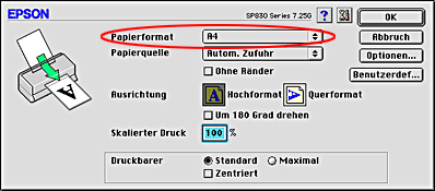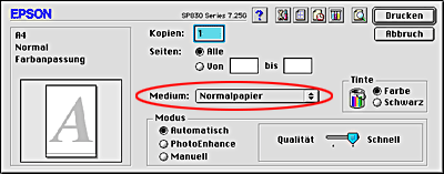 Auf dem Macintosh wählen Sie den gewünschten Medium im Dialogfenster Drucken und wählen Sie dann das gewünschte Papierformat im Dialogfenster Papierformat.