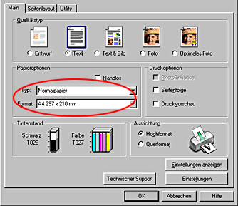 Unter Windows wählen Sie die gewünschten Einstellungen für Format und Typ unter Papieroptionen im Menü Haupteinstellungen.