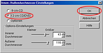 Wählen Sie 8 cm CD oder 12 cm CD/DVD und klicken Sie auf OK.