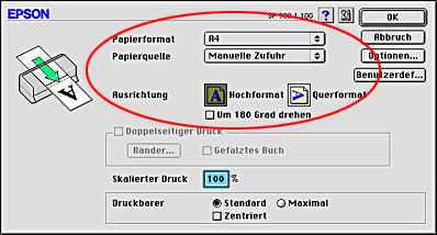 Wählen Sie Manuelle Zufuhr als Einstellung für Papierquelle, A4 als Einstellung für Papierformat und Hochformat als Einstellung für Ausrichtung.