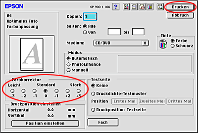 Wählen Sie CD/DVD als Medium und Druckposition-Testseite für Testseite und klicken Sie dann auf Drucken.