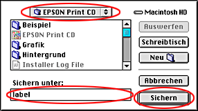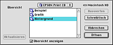 Doppelklicken Sie zum Starten von EPSON Print CD auf das Symbol Macintosh HD (Standard-Festplatte), auf den Ordner EPSON Print CD und dann auf das Symbol EPSON Print CD.