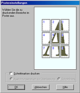 Wenn Sie nur einzelne Bildabschnitte und nicht das ganze Poster drucken möchten, klicken Sie auf Druckblätter auswählen, klicken Sie auf die Bildabschnitte, die Sie nicht drucken wollen, und dann auf OK.