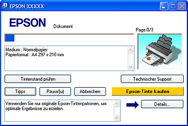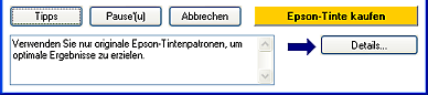 TippsIn einem Textfeld unten im Dialogfeld des Fortschrittsbalkens erscheinen Tipps, wie Sie den Epson-Druckertreiber optimal einsetzen können. Alle 15 Sekunden erscheint ein neuer Tipp. Wenn Sie mehr Informationen zum angezeigten Tipp wünschen, klicken Sie auf die Schaltfläche Details.