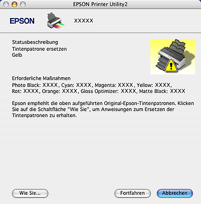 Sie können das Online-Benutzerhandbuch aus dem EPSON Status Monitor 3 aufrufen. Sollten Sie auf ein Problem stoßen, klicken Sie im Fenster EPSON Status Monitor 3 auf Technischer Support. Mac OS XVerwenden des EPSON StatusMonitorWenn der EPSON StatusMonitor einen Druckerfehler feststellt, informiert er Sie mit Hilfe einer Fehlermeldung.