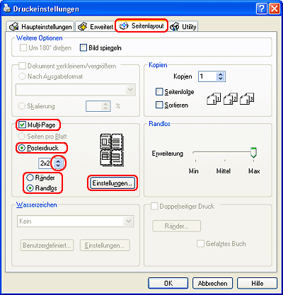 Im folgenden Beispiel zum Erstellen eines Posters ist 2x2 unter Posterdruck und Ausrichtungsmarken zur Überlappung als Schnittmarken drucken ausgewählt.
