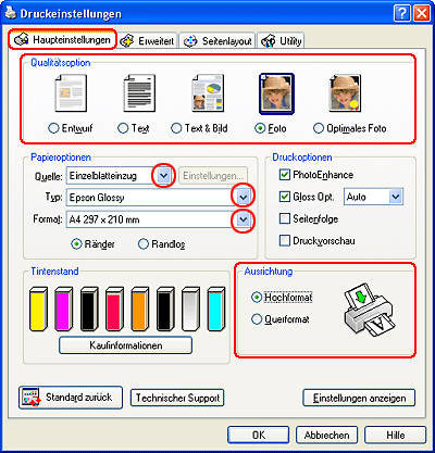 Klicken Sie auf die Registerkarte Haupteinstellungen, und wählen Sie anschließend eine der folgenden Qualitätsoption: