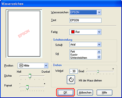 Vergewissern Sie sich, dass das entsprechende Wasserzeichen in der Liste mit den Wasserzeichen ausgewählt wurde, und wählen Sie anschließend die Einstellungen für Farbe, Position, Dichte, Format, Schrift, Stil und Winkel aus. (Weitere Informationen finden Sie in der Online-Hilfe.) Die Auswirkungen der Einstellungen sehen Sie im Vorschaufenster.