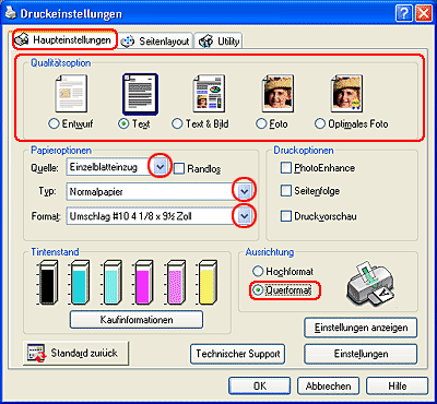 ![]() | Wählen Sie das gewünschte Briefumschlagformat als Einstellung für Papiergröße aus. |