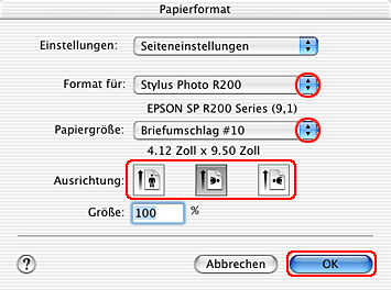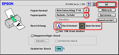 ![]() | Wählen Sie Stylus Photo R200 als Einstellung für Format für aus. |
