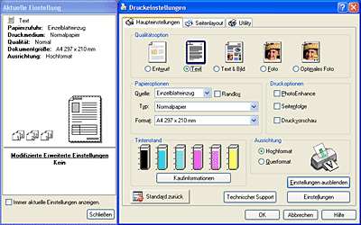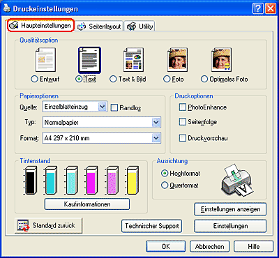 Sie können die Einstellungen Qualitätsoptionen, Papieroptionen, Druckoptionen, Ausrichtung und Erweitert vornehmen sowie die Tintenstände auf der Registerkarte Haupteinstellungen prüfen. Näheres finden Sie jeweils im entsprechenden Abschnitt weiter unten.