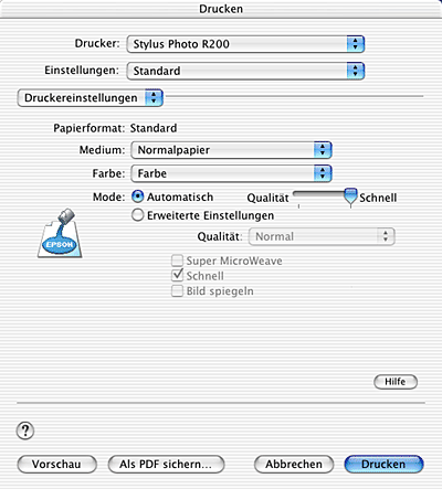 In diesem Modus können Sie auf schnelle und einfache Weise mit dem Drucken beginnen. Alle weiteren Einstellungen werden auf der Basis der aktuellen Einstellungen für Medium und Farbe von der Druckersoftware vorgenommen.