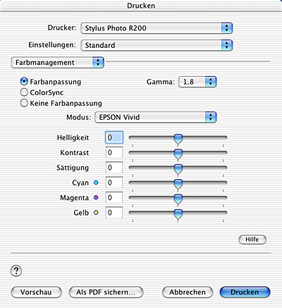 Durch die Wahl von Farbmanagement aus dem Popup-Menü erhalten Sie die Kontrolle über die Druckertreiber-Funktionen für Farbanpassung und -einstellung. Experimentieren Sie mit diesen Einstellungen, um neue Druckmöglichkeiten zu finden oder eine bestimmte Gruppe von Druckereinstellungen noch besser auf Ihre persönlichen Anforderungen abzustimmen.
