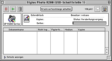 Nachdem Sie einen Druckauftrag übertragen haben, erscheint in der Taskleiste eine Schaltfläche EPSON Stylus Photo R200 Serie. Klicken Sie auf dieses Symbol, um den EPSON Spool Manager zu öffnen.