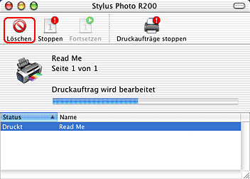 ![]() | Doppelklicken Sie im Dialogfeld Druckerliste auf Ihren Drucker, wählen Sie das in Druck befindliche Dokument in der Liste der Dokumentennamen aus und wählen Sie dann Auftrag löschen im Menü Aufträge in der Menüleiste aus. |