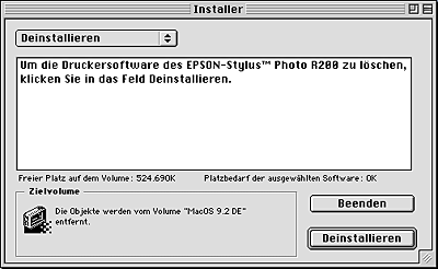 Ziehen Sie den Ordner Referenzhandbuch, der sich im Ordner EPSON STYLUS PHOTO R200 Serie befindet, von der Festplatte in den Papierkorb. Ziehen Sie dann das Symbol ESPR200 Referenzhandbuch vom Desktop Computer in den Papierkorb.