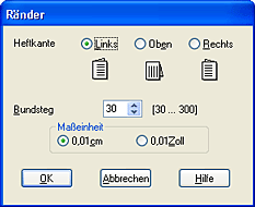 Der tatsächliche Bindungsrand kann abhängig von der Anwendung von den vorgegebenen Einstellungen abweichen. Drucken Sie einige Testseiten aus, bevor Sie den gesamten Druckauftrag starten.
