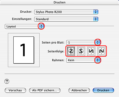 Nehmen Sie die erforderlichen Einstellungen für Format für vor. Wählen Sie Stylus Photo R200 zum Drucken mit Standardrändern aus. Siehe Druckbereich