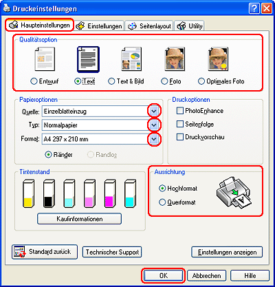 Wählen Sie die geeigneten Einstellungen für Papiergröße und Ausrichtung aus. Sie können auch ein eigenes Papierformat definieren. Nähere Informationen finden Sie in der Online-Hilfe.