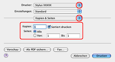 Wählen Sie unter der Einstellung Drucker den verwendeten Drucker aus. Nehmen Sie dann die Einstellungen für Kopien & Seiten vor.