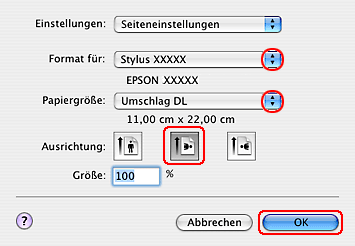 Wählen Sie das gewünschte Briefumschlagformat aus den verfügbaren Einstellungen für Größe aus. Sie können auch ein eigenes Papierformat definieren. Nähere Informationen finden Sie in der Online-Hilfe.