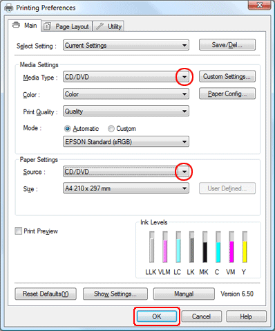 Wählen Sie CD/DVD oder CD/DVD Premium Surface als Einstellung für Media Type (Medium) aus.