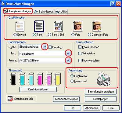 ![]() | Nehmen Sie die erforderlichen Einstellungen für Papierformat und Ausrichtung vor. |