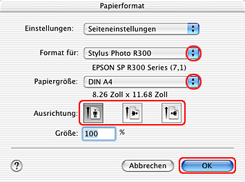 ![]() | Nehmen Sie die erforderlichen Einstellungen für Format für vor. Wählen Sie Stylus Photo R300 zum Drucken mit Standardrändern aus. |