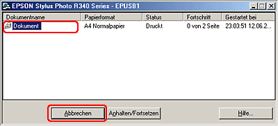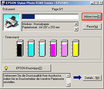 Mit Hilfe des Fortschrittsbalkens oder des EPSON Spool Managers ist es möglich, den laufenden Druckauftrag abzubrechen. Näheres finden Sie jeweils im entsprechenden Abschnitt weiter unten.