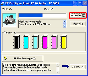 Klicken Sie auf die Schaltfläche Abbrechen, um den Druckauftrag abzubrechen.