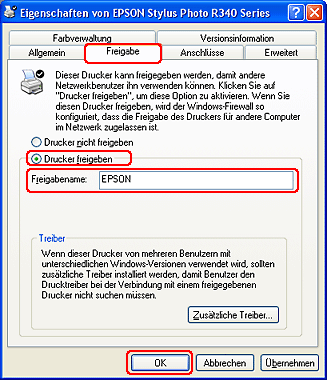 Wenn Sie möchten, dass Windows XP oder 2000 automatisch Druckertreiber für Computer herunter lädt, die unter verschiedenen Windows-Versionen funktionieren, klicken Sie auf Zusätzliche Treiber. Wählen Sie dann die Betriebsumgebung und das Betriebssystem für die anderen Computer aus. Klicken Sie auf OK und legen Sie die Druckertreiber-CD-ROM in das CD-ROM-Laufwerk ein.