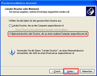 Wählen Sie Netzwerkdrucker oder ein an einen anderen Computer angeschlossenen Drucker aus und klicken Sie auf Weiter.