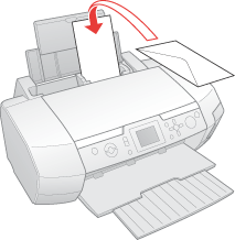 Legen Sie Briefumschläge mit einer kurzen Seite voran und der Umschlagklappe nach unten und links ein: