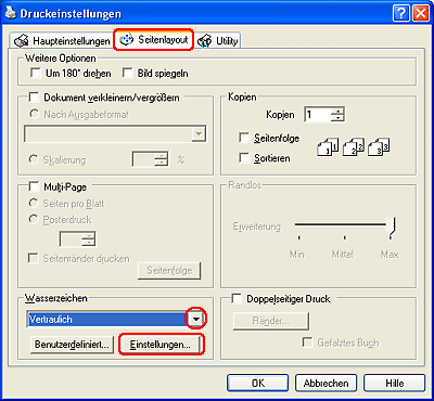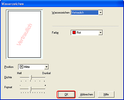 Mit der Funktion Wasserzeichen drucken können Sie ein textbasiertes oder ein bildbasiertes Wasserzeichen auf das Druckmedium drucken.