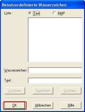 Um eine Bilddatei als Wasserzeichen zu verwenden, klicken Sie auf die Schaltfläche BMP. Klicken Sie auf Durchsuchen, um die gewünschte Bitmap-Datei zu suchen, und anschließend auf OK. Geben Sie im Textfeld "Name" einen Namen für das Wasserzeichen ein und klicken Sie anschließend auf Speichern.