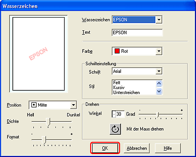Stellen Sie sicher, dass Sie das gewünschte Wasserzeichen in der Liste Wasserzeichen ausgewählt haben, und wählen Sie dann die Einstellungen für Farbe, Position, Dichte, Format, Schriftart, Schriftstil und Winkel. (Nähere Informationen finden Sie in der Online-Hilfe.) Ihre Einstellungen werden im Vorschaufenster berücksichtigt.