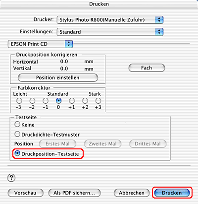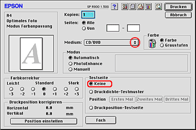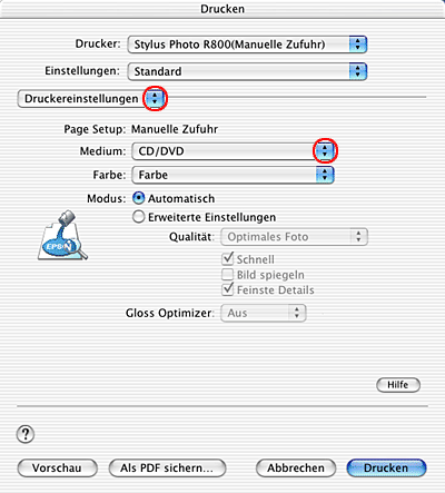 Wählen Sie Stylus Photo R800 (Manueller Einzug) als Einstellung für Drucker. Wählen Sie Druckereinstellungen aus dem Pulldown-Menü aus. Wählen Sie CD/DVD als Einstellung für Medientyp.
