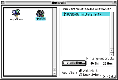 Wählen Sie im Apple-Menü die Option Auswahlaus, klicken Sie auf das entsprechende Druckersymbol und wählen Sie dann die Schnittstelle, mit der der Drucker verbunden ist, aus.
