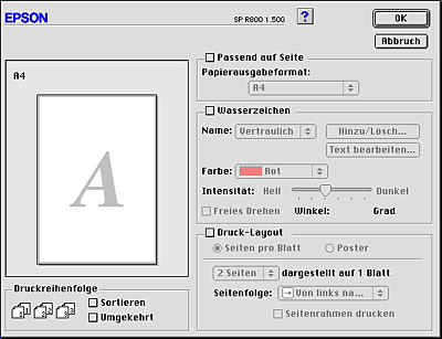 Sie können das Seitenlayout des Dokuments mit Hilfe der Druckertreibereinstellungen im Dialogfenster Layout ändern. Um das Dialogfenster aufzurufen, klicken Sie in Ihrer Anwendung im Menü Ablage auf Drucken. Klicken Sie dann im Dialogfenster zum Drucken auf die Schaltfläche