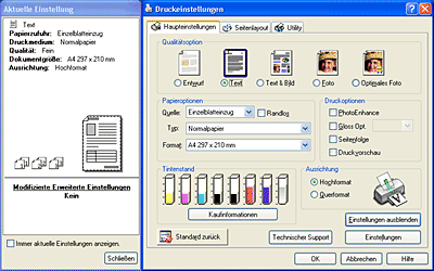 Sie können die Einstellungen Qualitätsoptionen, Papieroptionen, Druckoptionen, Ausrichtung und Erweitert vornehmen sowie die Tintenstände auf der Registerkarte Haupteinstellungen prüfen. Näheres finden Sie jeweils im entsprechenden Abschnitt weiter unten.