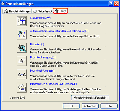 Um die Utilitys zu benutzen, klicken Sie in der Druckersoftware auf die Registerkarte Wartung und anschließend auf die Schaltfläche des Utilitys, das Sie benutzen möchten. Beachten Sie die nachfolgenden Abschnitt für den Zugang zur Druckersoftware.