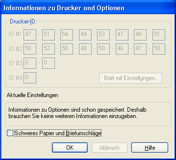 Die im Dialogfeld Drucker- und Optionen-Informationen angezeigten Informationen werden abhängig von der Systemkonfiguration automatisch aktualisiert oder müssen manuell eingegeben werden.