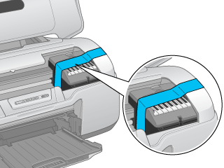 Öffnen Sie erneut die Druckerabdeckung. Befestigen Sie die Patronenhalterung mit Klebeband am Drucker, wie unten gezeigt, und schließen Sie die Druckerabdeckung.