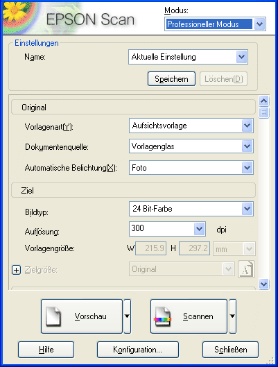 Gehen Sie folgendermaßen vor, um die richtigen Einstellungen für das Scannen von Fotos (reflektierende Dokumente) im professionellen Modus vorzunehmen.