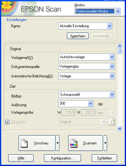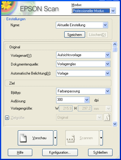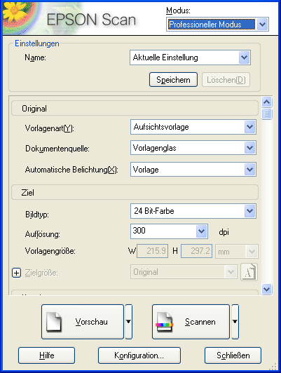 ![]() | Starten Sie EPSON Scan und wählen Sie dann den professionellen Modus. Informationen zum Wählen eines Scanmodus finden Sie unter Scanmodus ändern. |