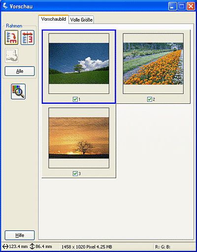 Im Fenster Miniaturen-Vorschau: EPSON Scan erkennt automatisch die einzelnen Fotos und zeigt sie als Miniaturen an. Aktivieren Sie das Nummern-Kontrollkästchen des Bildes, das Sie scannen möchten.